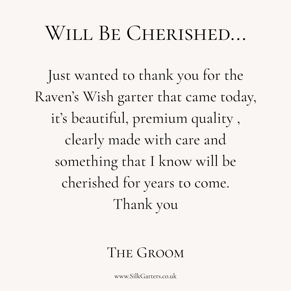 Just wanted to thank you for the Raven’s Wish garter that came today, it’s beautiful, premium quality , clearly made with care and something that I know will be cherished for years to come.